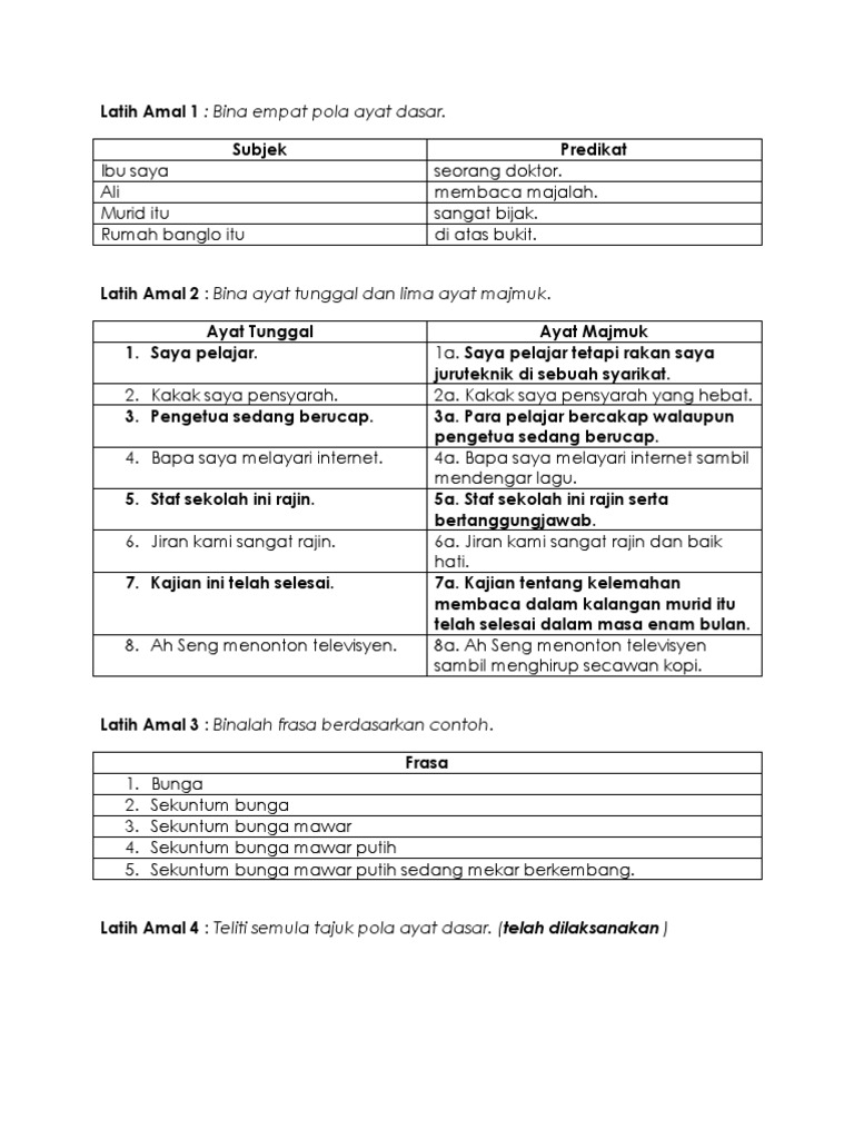 532 i Bimbing murid memahami dan menggunakan ayat tunggal. Sesungguhnya Kami telah memberikan kepadamu nikmat yang banyak. Ayat-ayat yang gramatis ialah ayat yang lengkap dan sempurna mengandungi paling kurang satu subjek dan satu predikat.
